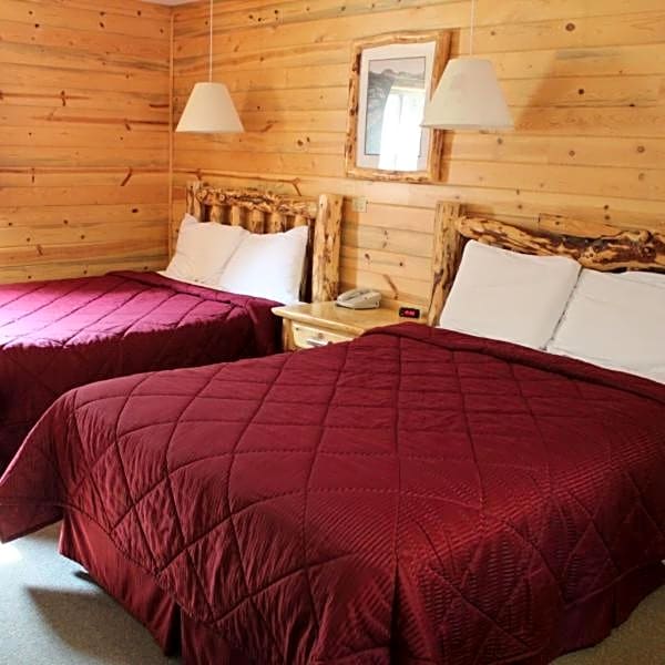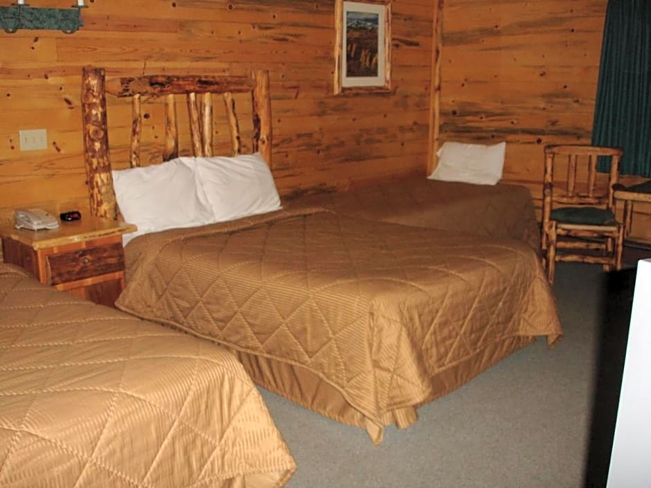 Featuring pine walls, this room includes a cable TV, a refrigerator, a microwave, and log-style beds.